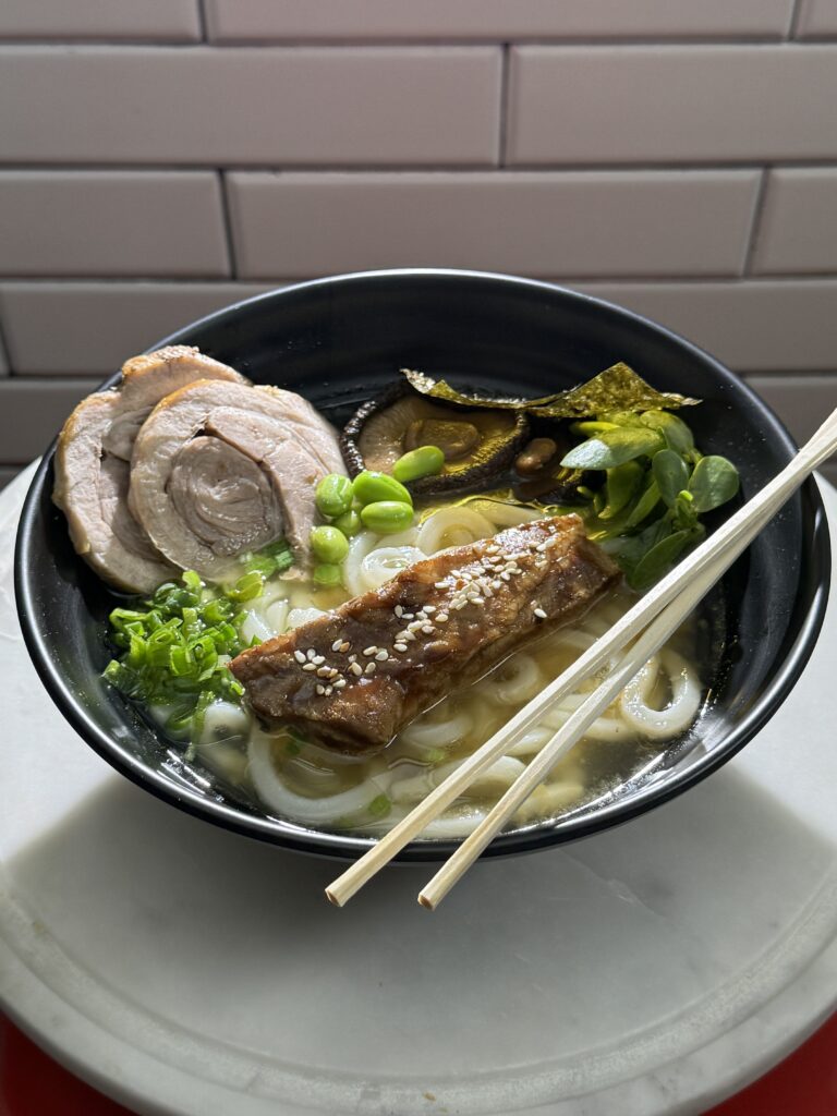 Aquí el Udon es su ingrediente estrella. Lo encuentras tanto en el ramen, como en platillos salados y dulces. La recomendación para probar es el Okonomiyaki mexa, su versión de la “pizza japonesa” pero en forma de tortilla empalmada o taco sonorense. Su Katsu Sando con crema de cacahuate y mostaza brûlée. Con pan de betabel. O su Udon Carbonara con pork belly. Además, cuentan con una carta de bebidas donde destacan sus tragos diseñados con calpis, su michelada con