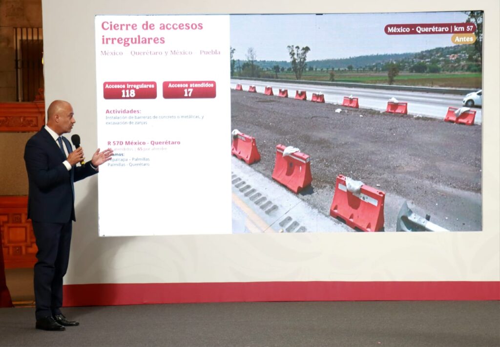 Al abundar sobre las acciones que la SICT implementa en carreteras por instrucciones de la Presidenta, el secretario señaló que se tienen detectados 118 accesos irregulares en las carreteras México-Querétaro y en la México-Puebla y se han atendido 17.
