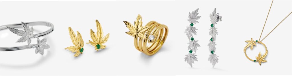 La colección incluye sortijas con hojas envolventes y piedras centrales que simbolizan el ciclo vital, pulseras y colgantes que celebran la renovación constante de la naturaleza, pendientes articulados en cascada, broches que representan el movimiento fluido de las ramas.