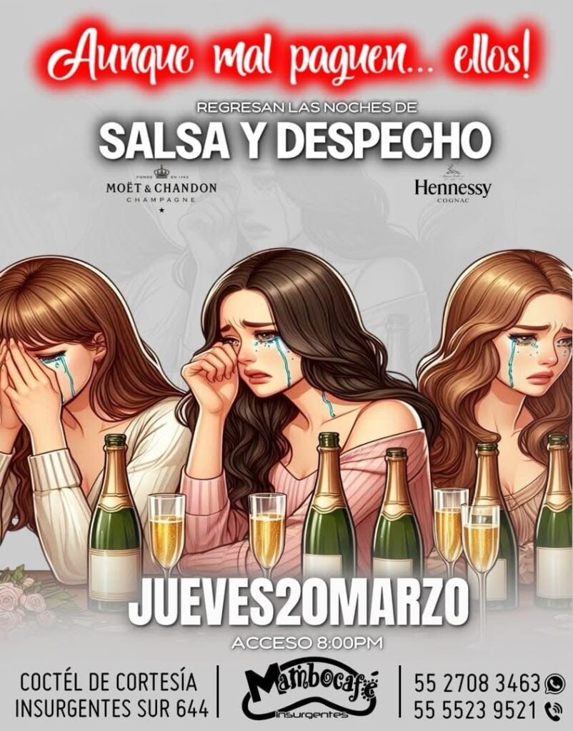 El amor duele, pero la música cura. Y si no, que lo digan las mujeres que ya están listas para sacudirse el despecho y reírse de los malos amores en la fiesta temática “Aunque mal paguen ellos”, que se llevará a cabo el próximo jueves 20 de marzo en el icónico Mambo Café Insurgentes, en la Ciudad de México. Este evento, diseñado especialmente para aquellas que han sufrido los embates del desamor, promete ser una noche llena de salsa, despecho y mucha, mucha catarsis colectiva. Porque, seamos honestas, ¿quién no ha querido bailar hasta el cansancio mientras le dedica una canción a ese ex que no supo valorarla?