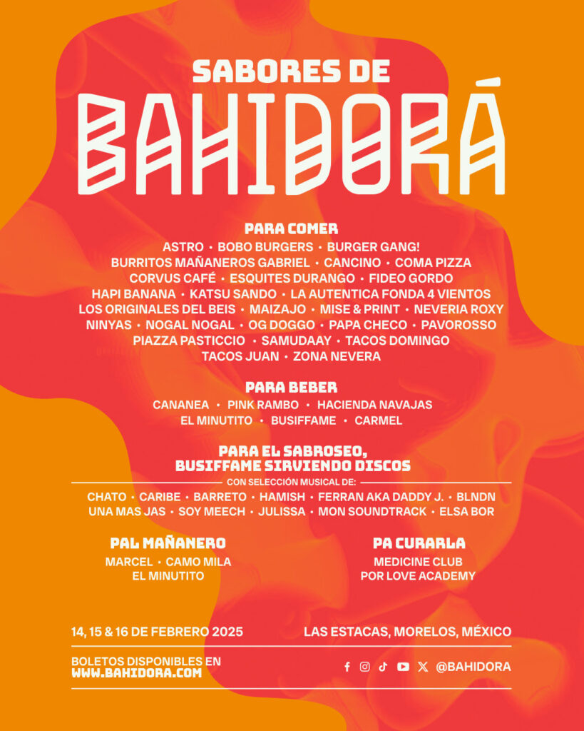 Este año Bahidorá regresa del 14 al 16 de febrero de 2025 en Las Estacas, Morelos, con un Line-Up estelar que contará con artistas de la talla de KAYTRANADA, Floating Points (Live Act), Folamour, Ezra Collective, ESG, Jeff Mills, Ben UFO, Theo Parrish, Call Super, Ca7riel & Paco Amoroso, Los Askis, Joy Orbison, Nicola Cruz, Rusowsky y muchxs más: pero además de la música increíble, el entorno natural y el circuito de arte que el festival ofrece año con año, en esta ocasión podrás disfrutar de una selección gastronómica diseñada para que vivas una travesía versátil, deliciosa y siempre a la mano con selectas propuestas de la Ciudad de México y Yautepec. Tú decides si quieres hacer un picnic rélax dentro del festival o hacer paradas rápidas para recargar energía y enfocar tu tiempo en la música: hay de todo para todxs, ¡la vida es easy #EnBahidorá!