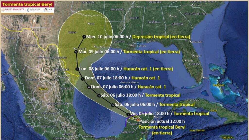 Beryl tocó tierra como huracán en la costa mexicana de Yucatán en las primeras horas del viernes, pero ya se ha debilitado a tormenta tropical, con vientos de hasta 70 millas por hora y una “peligrosa” marejada.