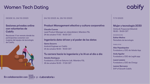“En esta edición queremos llevar la iniciativa de Women Tech Dating a un siguiente nivel, y la colaboración con Female Startups Leaders y Laboratoria es imprescindible para cumplir este objetivo. Las tres organizaciones compartimos objetivos para avanzar hacia la reducción de la brecha de género en posiciones STEM, pues creemos firmemente que la diversidad enriquece a todos los equipos”, declara Irene Recio, Global Head of PR de Cabify.