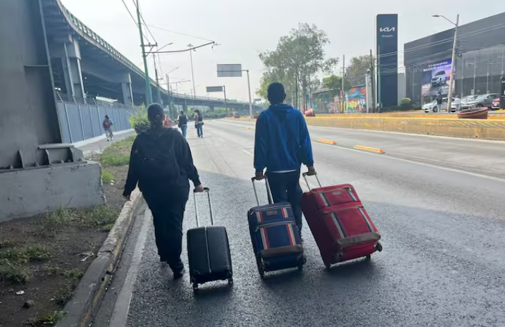 Maestros ingresan a las terminales 1 y 2 del AICM. Cientos de usuarios tienen que caminar maleta en mano para llegar a la terminal a´rea y abordar sus vuelos que registran retrasos.
