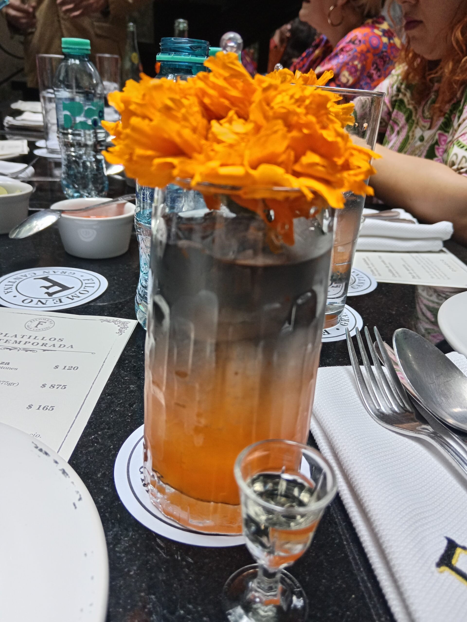 Y no podía faltar con este menú degustación una bebida muy ad hoc a la fecha llamada Catrina, muy colorida, con un excelente toque de carbón y no podía faltar el adorno de la flor de cempasúchil.