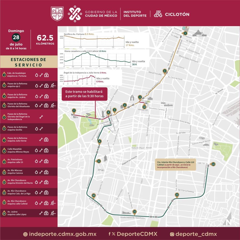 El Instituto del Deporte de la Ciudad de México (INDEPORTE) informa que derivado del Adidas Split 30K, durante el Ciclotón del mes de julio, que se realizará el próximo domingo 28, de 08:00 a 14:00 horas, el tramo que comprende de la Diana Cazadora a Julio Verne tendrá una modificación de horario por lo que quedará liberado hasta las 9:30 horas.