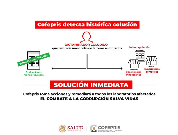 La Comisión Federal para la Protección contra Riesgos Sanitarios (Cofepris) informa que ha detectado un esquema de colusión al interior de la institución, el cual favorecía al menos a una empresa con evaluaciones menos estrictas, mientras que a otras se les imponían requisitos excesivos e innecesarios.