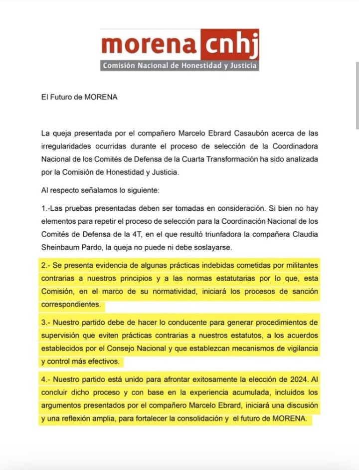 “Les comparto el texto que me hizo llegar la Comisión de Honestidad y Justicia de Morena respecto a la queja que presenté”, escribió en la red social X y acto seguido posteo la cartita de la comisión que ha desechado sistemáticamente sus queja ante el partido guinda.