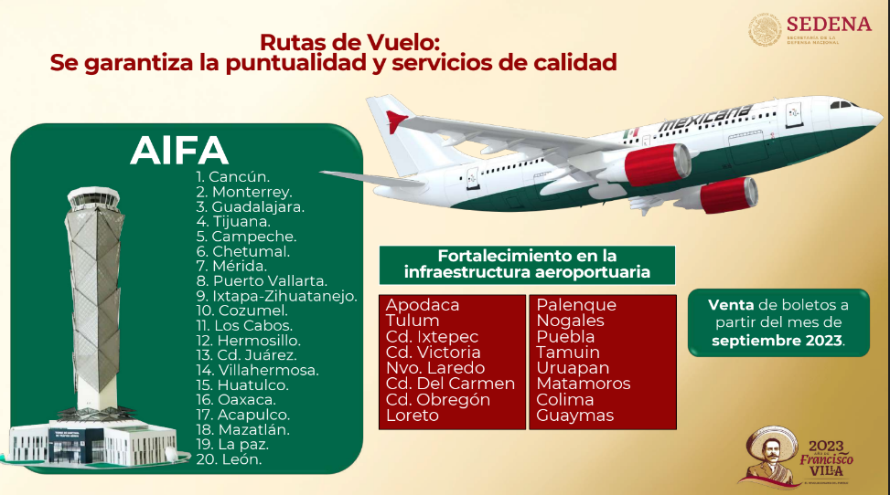 Al garantizar un “servicio de calidad a un costo accesible”, detalló que la base principal será en el Aeropuerto Internacional Felipe Ángeles (AIFA) así como una segunda base en el nuevo aeropuerto de Tulum, comenzará con 20 destinos, todos nacionales y retomado las rutas que tenía autorizadas la empresa.
