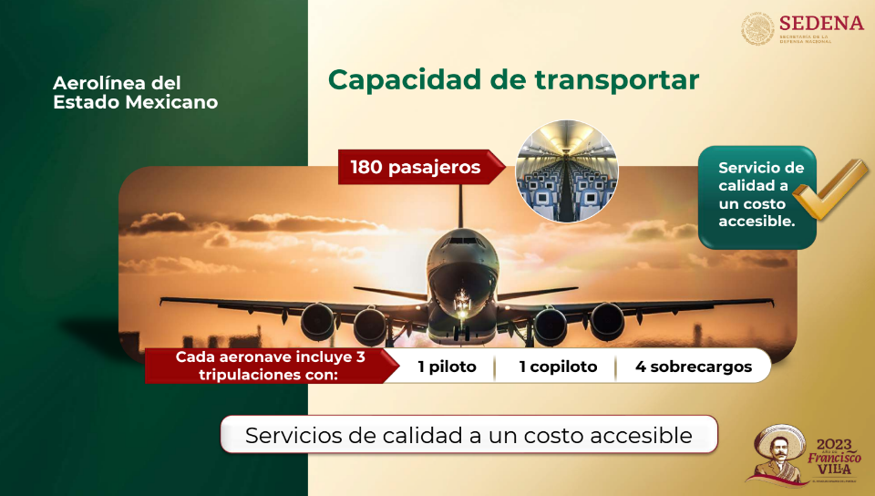 Al detallar el inicio de operaciones de la Aerolínea del Estado Mexicano, el titular de la Secretaría de la Defensa Nacional, Luis Crescencio Sandoval, indicó que al momento del vuelo se arrendarán 10 aviones Boeing 737-800 los cuales a más tardar en octubre se tendrán en su totalidad en poder de la nueva empresa. (3 el 30 de septiembre y los restantes en octubre), la capacidad será de 180 pasajeros en una sola clase con 18 y 20% menos de costo en el boleto.