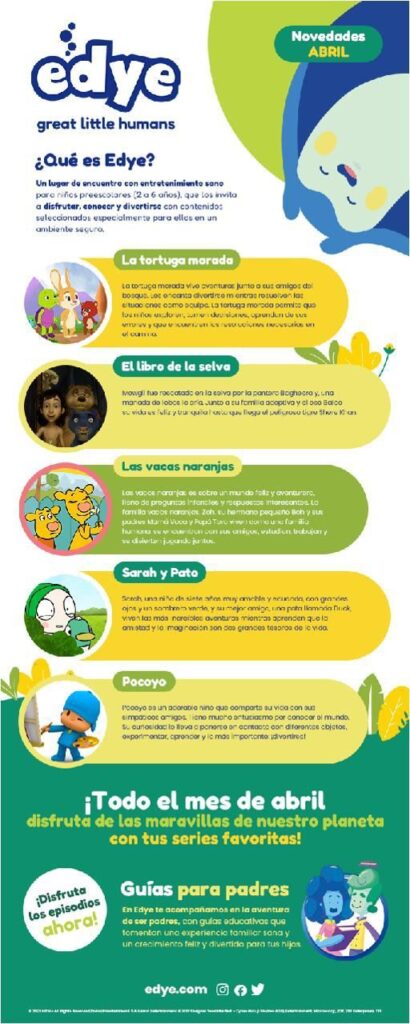 Series como La Tortuga Morada, Las Vacas Naranjas, El Libro de la Selva, Sarah y Pato y Pocoyó forman parte de esta programación especial, cada una con mensajes que inspiran empatía, cooperación, curiosidad por el entorno y una conexión profunda con la naturaleza. Además, Edye pone a disposición de madres, padres y cuidadores guías educativas que promueven experiencias familiares sanas y un crecimiento feliz para niñas y niños.