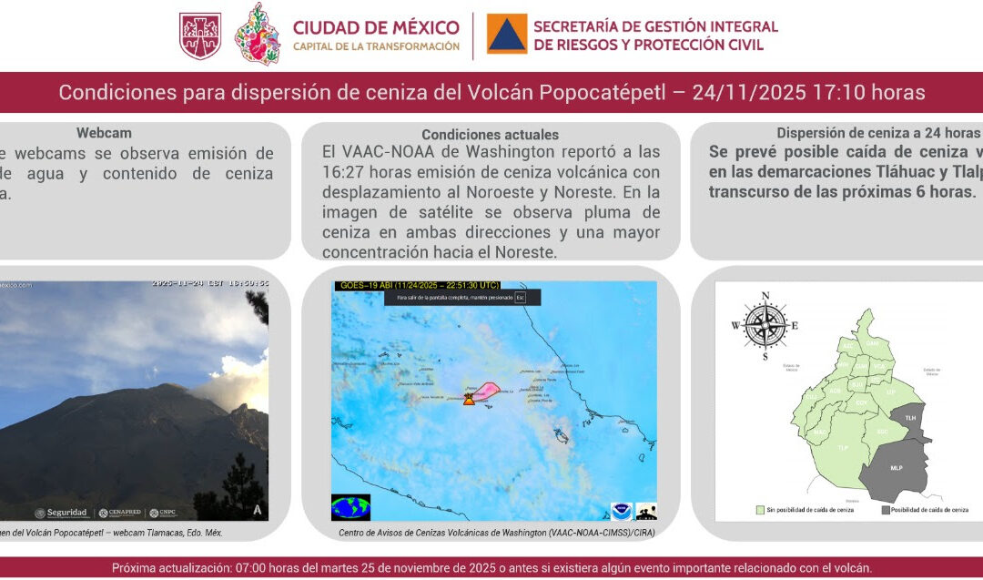 La Secretaría de Gestión Integral de Riesgos y Protección Civil (SGIRPC) informa que, de acuerdo al monitoreo del volcán Popocatépetl, se observa emisión de vapor de agua y contenido de ceniza volcánica, por lo que se prevé que la pluma de ceniza se desplace con dirección Noroeste y Noreste, provocando afectación en las demarcaciones de Tláhuac y Tlalpan.