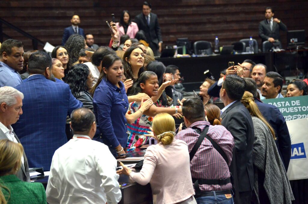 Esto motivó que diputados de oposición tomarán la tribuna, segundos después una decena de legisladoras de Morena subieron a tribuna para tratar de rodear a la secretaria de la Mesa Directiva, la también diputada morenista Brenda Espinoza, lo que derivó en jaloneos y empujones.