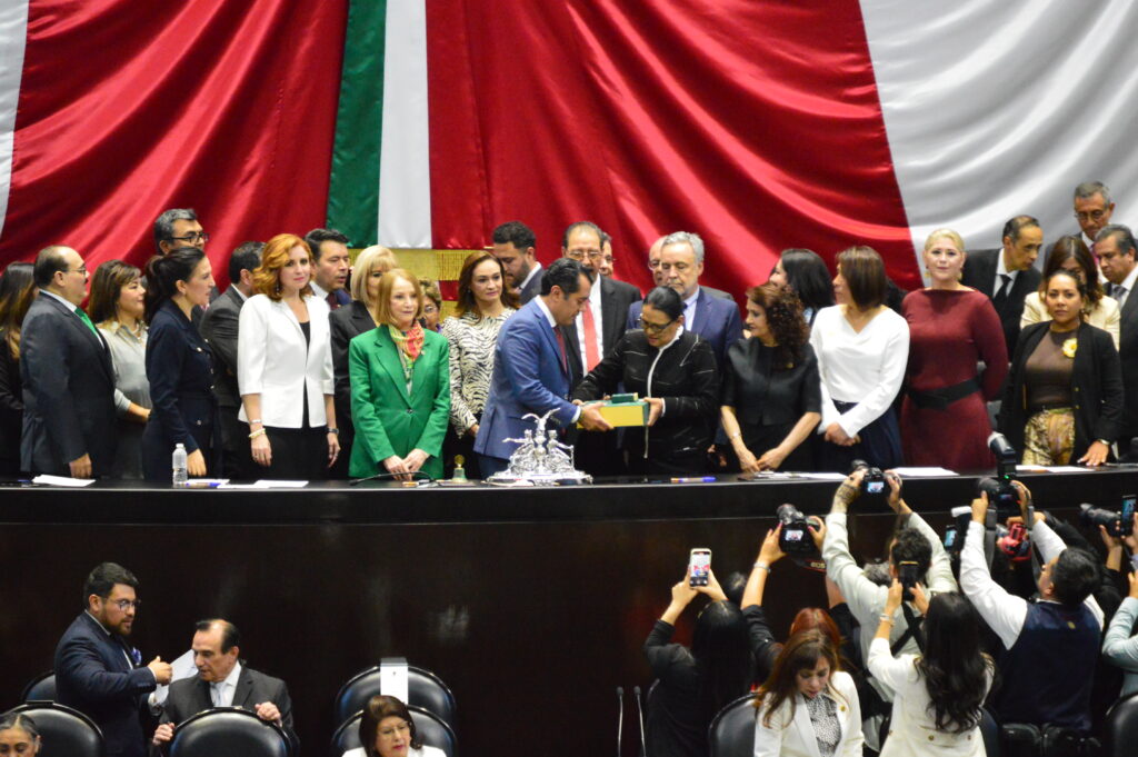 La secretaria de Gobernación, Rosa Isela, entregó el libro del Primer Informe de Gobierno de la Presidenta Claudia Sheinbaum, lo recibió el presidente de la Cámara de Diputados, Sergio Gutiérrez.