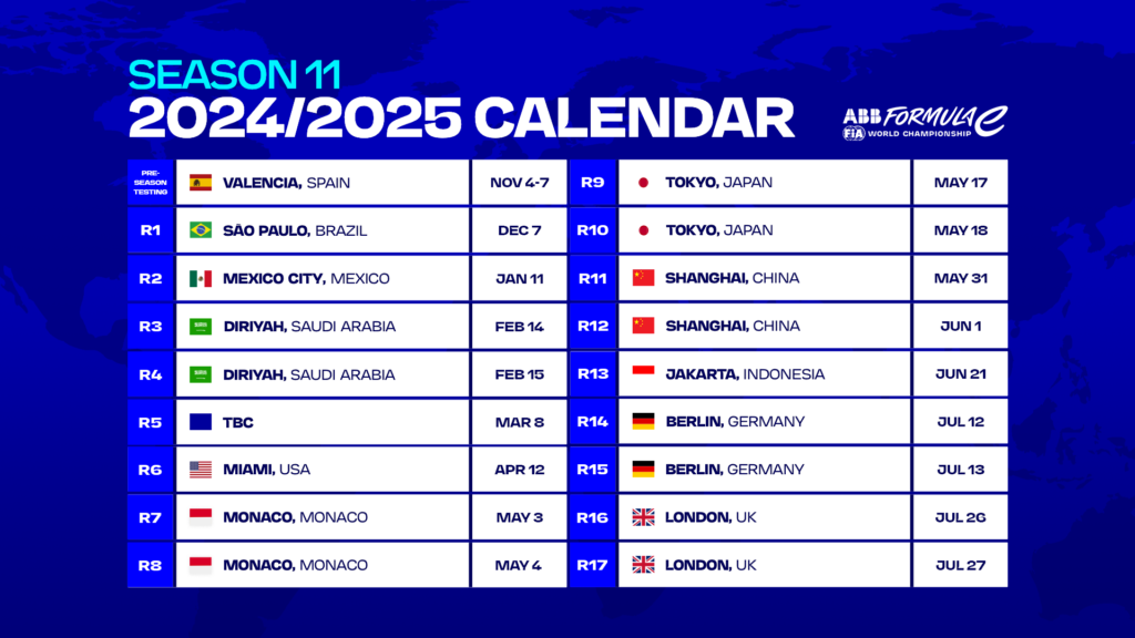 LONDRES. REINO UNIDO. MARTES 11 DE JUNIO, 2024 – La Formula E ha anunciado hoy su calendario provisional para la Temporada 11 del ABB FIA Formula E World Championship, con el mayor número de carreras y lugares establecidos para una temporada, tras la validación del FIA World Motorsport Council.