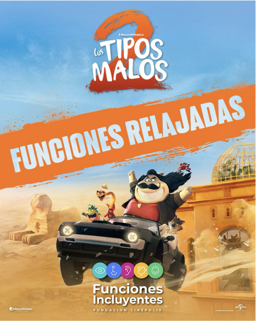 | ¿Quién asesora las condiciones de las Funciones relajadas? Las Funciones Relajadas cuentan con el asesoramiento de la ONG Iluminemos por el Autismo, así como de especialistas en inclusión social y cultural de personas neurodivergentes, convivencia y accesibilidad. ¿Cuándo estarán disponibles? Las funciones relajadas de Tipos Malos 2 estarán disponibles los fines de semana del 9 al 17 de agosto:Sábado 9 y domingo 10 agosto.Sábado 16 y domingo17 agosto.Y, se proyectarán en los siguientes complejos Cinépolis de México:Cinépolis Las Américas Ecatepec (Estado de México)Cinépolis Plaza Escala Morelia (Michoacán)Cinépolis Las Américas Xalapa (Veracruz)Cinépolis Galerías Monterrey (Nuevo León)Cinépolis Universidad (CDMX)Cinépolis Town Center El Rosario (CDMX)Cinépolis Las Américas Mérida (Yucatán)Cinépolis Galerías Guadalajara (Jalisco)Cinépolis Angelópolis Puebla (Puebla) |