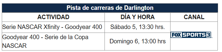 Por otro lado, Byron tiene el objetivo de dar una mejor actuación que la mostrada en la carrera pasada. Si bien ya ha asegurado un lugar en los Playoffs, tiene en la mira conquistar su segunda victoria este fin de semana. Otro piloto que está viviendo un gran momento es Christopher Bell quién ha sumado tres victorias este 2025 y no se le puede descartar en la pista a la que llegue; Sin embargo, históricamente, Darlington es una de las más complicadas para él con sólo tres top 10 en 11 salidas.