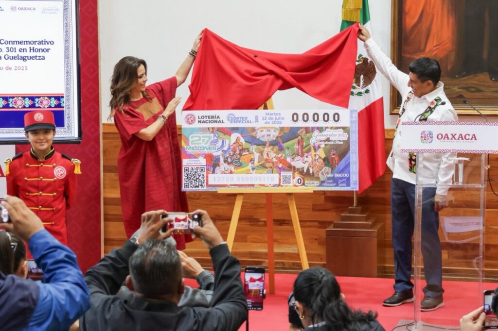 El Sorteo Especial No. 301 tendrá como imagen central la tradicional fiesta de la Guelaguetza y se celebrará el próximo martes 22 de julio en el corazón de Oaxaca, así lo anunciaron el gobernador del estado, Salomón Jara Cruz, y la directora general de Lotería Nacional, Olivia Salomón, al develar el billete conmemorativo en el Palacio de Gobierno de la entidad.