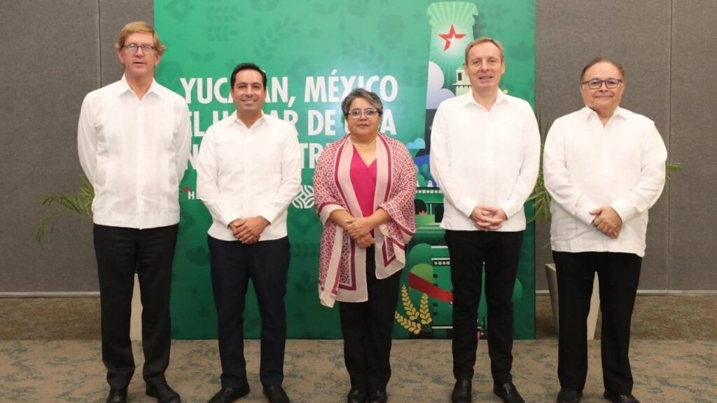 La secretaria de Economía, Raquel Buenrostro; el gobernador de Yucatán, Mauricio Vila ; y el director general de @HeinekenMexico, Guillaume Duverdier; anunciaron una inversión de más de 8 mil millones de pesos en una nueva planta de cerveza que se instalará en Kanasín, Yucatán. Esto es resultado de la confianza del sector empresarial y del favorable entorno económico del país.