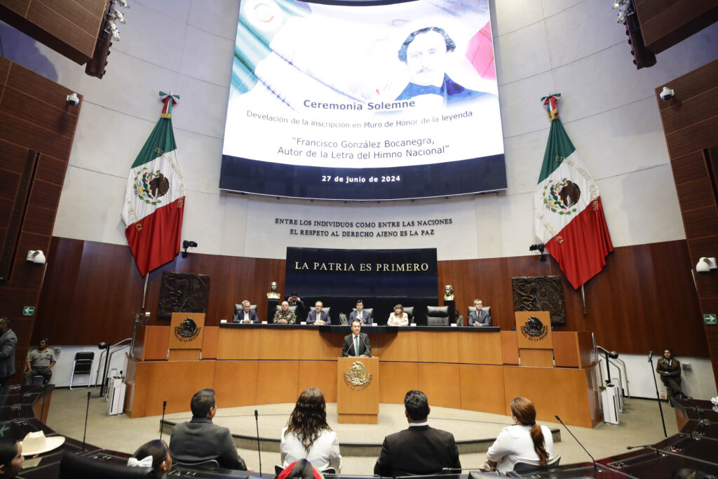 En ceremonia solemne, el Senado de la República develó, en el Muro de Honor de esta Cámara, la leyenda “Francisco González Bocanegra, autor de la letra del Himno Nacional”, como una manera de reconocer su contribución por la creación de uno de los símbolos más importantes de nuestra identidad nacional. El senador Sergio Pérez Flores, presidente en turno de la Mesa Directiva, explicó que este acto surge de una iniciativa que presentó el 9 de febrero de 2023 la senadora del PVEM, Graciela Gaitán Díaz. Detalló que, Francisco González Bocanegra fue orador, poeta lírico, dramaturgo, critico teatral, articulista y autor del Himno Nacional Mexicano. “Su pensamiento se desarrolló en el contexto de la controversia entre conservadores y liberales que se dio a lo largo del Siglo XIX. Ya como hombre de letras participó en la convocatoria, que se emitió en el año de 1853, durante la presidencia de Antonio López de Santa Anna, para escribir el Himno Nacional”, indicó. Las estrofas del texto se publicaron en el Diario Oficial de la Federación el 3 de febrero de 1854, y se cantó por primera vez, con la música compuesta por Jaime Nunó, compositor español, el 15 de septiembre de ese año, en el Teatro Santa Ana, mismo que más tarde, se convirtió en el Teatro Iturbide. El senador agregó que González Bocanegra fue un hombre multifacético que escribió diversas publicaciones, pero consideró que el Himno Nacional Mexicano es su legado, porque “la letra de este canto ha resonado en los corazones de generaciones de mexicanos y mexicanas y es un faro de orgullo para nuestra nación”. Este Himno, dijo el legislador, no sólo es una composición poética, sino un símbolo de lucha, de sueños y esperanza de un pueblo entero. Es mucho más que una simple canción, es una insignia de identidad, melodía y orgullo que une a los mexicanos en cada rincón del país y más allá de nuestras fronteras. Pérez Flores destacó que, en esta ceremonia, el Senado no sólo recuerda la vida y obra del autor, sino reafirma su compromiso con los ideales de libertad, justicia y democracia que González Bocanegra tanto valoró. La senadora María Graciela Gaitán Díaz, quien promovió inscribir esta leyenda en el Muro de Honor, subrayó que la obra de González Bocanegra es un “canto patriótico que sigue enalteciendo la soberanía e independencia nacionales”, además de que inspira a millones de mexicanos valor, fuerza, unión y esperanza. “Escuchar y entonar cada una de esas estrofas, nos regresa en el tiempo y nos hace sentir orgullosos de ser mexicanos, porque es un poema de aquellas mexicanas y mexicanos visionarios que, con su valentía, nos dieron libertad y patria. Sin importar la latitud en donde se encuentre un mexicano, nuestro himno nacional nos hace sentir en casa”, añadió. La legisladora por el PVEM destacó que González Bocanegra nació y se formó en una época convulsa, donde él y su familia sufrieron la condena del destierro, aunque después volvió a su tierra natal, San Luís Potosí, en los albores del México independiente, lo que le dio una complejidad artística con la que sintetizó los valores, anhelos e ideales de México en el Himno. Aplaudió también a Guadalupe González del Pino, esposa del autor, quien lo impulsó y respaldó para inscribirse en el concurso de composición de 1853, cuyo veredicto fue la elección de sus letras y el nacimiento del Himno Nacional Mexicano. “Este hecho da cuenta de la importancia de las mujeres en todas y cada una de las etapas de nuestra historia”, destacó Gaitán Díaz. El titular de la Secretaría de Educación de San Luis Potosí, Juan Carlos Torres Cedillo, destacó la aportación tan relevante de Francisco González Bocanegra para la historia y legado de nuestro país, así como para la construcción de una nación libre, soberana, democrática e independiente. Además, el funcionario aseguró que es un honor que el estado de San Luis Potosí forme parte de la historia de la creación de nuestro Himno Nacional, el cual es uno de los más hermosos y reconocidos a nivel mundial. Mario García Valdez, secretario de Cultura del Gobierno del Estado de San Luis Potosí, consideró que el Himno Nacional Mexicano es el “único poema que todos los mexicanos saben y repiten”, razón suficiente para inscribir en el Muro de Honor del Senado el nombre de su autor, quien nació el 8 de enero de 1824 en esa entidad del Bajío mexicano. En la ceremonia también se les entregaron reconocimientos a los alumnos de la Escuela Primaria Francisco González Bocanegra, de San Luis Potosí. Posteriormente, los estudiantes entonaron el Himno Nacional.