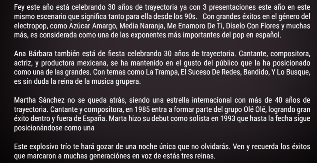 Cada una presentando sus canciones más representativas, a lo largo del gran espectáculo, para en algunos momentos sorpresivos disfrutar de la presencia de las tres en el escenario con colaboraciones, duetos, tríos e invitados sorpresa..