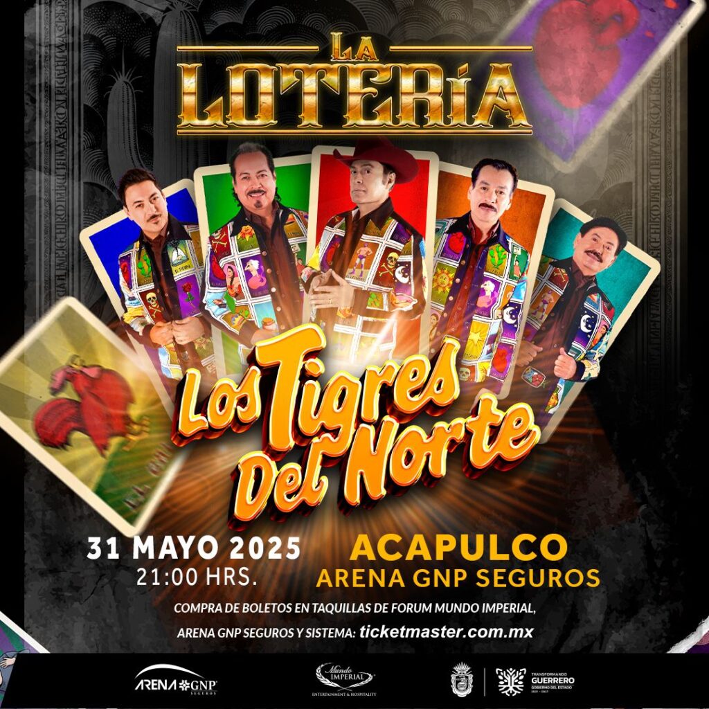 Este mes, Acapulco suena más fuerte que nunca con la llegada de Los Tigres del Norte a la Arena GNP Seguros Mundo Imperial. La leyenda del regional mexicano se presentará este sábado 31 de mayo como parte de su espectacular gira “La Lotería Tour 2025”, en un concierto que promete ser un viaje cargado de emoción, fuerza y nostalgia. Una noche para cantar, sentir y celebrar, como solo ellos saben hacerlo.