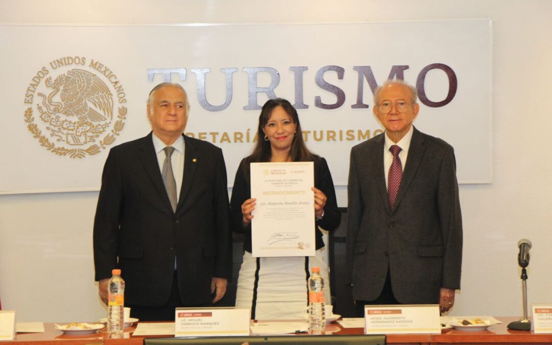 El secretario de Turismo entregó reconocimientos a la directora de Financiamiento para el Sector Turístico de Bancomext-Nafin, Yvette Valenzuela Becerra; a la directora de Gestión Estratégica y Enlace Interinstitucional del Fondo Nacional de Fomento al Turismo (Fonatur), Violeta Abreu González; al director general adjunto de Administración y Jurídico de Fira, Rolando Jesús González Flores; a la gerente de Políticas Públicas de Meta, Eliana Pérez Gaffney; al director de Turismo de CAF – Banco de Desarrollo de América Latina y el Caribe, Oscar Rueda García; y al director de Planeación Estratégica del Fondo para el Desarrollo Social del Gobierno de la Ciudad de México (Fondeso), Luis Alberto Trujillo Castillo. Así mismo, se entregaron reconocimientos a los ejecutivos participantes en los Seminarios y Talleres de Financiamiento, por su contribución al impulso de la actividad turística.