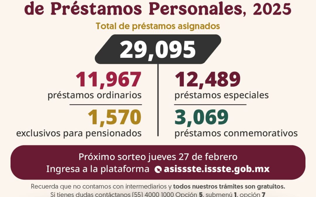 El Instituto de Seguridad y Servicios Sociales de los Trabajadores del Estado (ISSSTE), encabezado por el director general Martí Batres Guadarrama, anuncia que en el cuarto sorteo del Programa Anual de Préstamos Personales 2025 se concedieron 29 mil 095 créditos, los cuales cumplieron los requisitos.