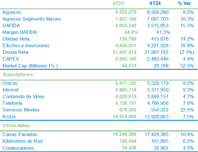 Los resultados de Megacable en el 4T25 reafirman la solidez de su estrategia de expansión, evolución de red y consolidación operativa. La Empresa continúa fortaleciendo su infraestructura y oferta de servicios, posicionándose para capitalizar nuevas oportunidades de crecimiento en el mercado mexicano de telecomunicaciones.