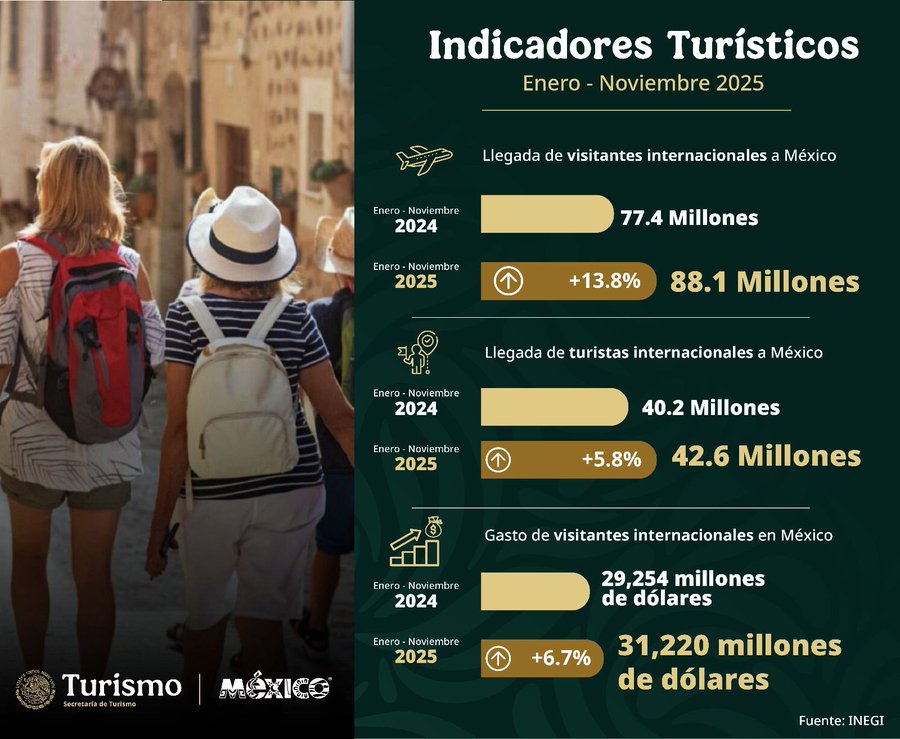Indicó que únicamente en noviembre de 2025 ingresaron al país 8.79 millones visitantes, lo que representó un incremento de 15.6 por ciento respecto al mismo mes de 2024. Además, las divisas derivadas del gasto de visitantes sumaron 3 001.6 millones de dólares, 9 por ciento más que en el mismo periodo del año previo.