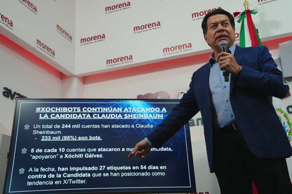 Mario Delgado apuntó que casi todas las cuentas que han atacado a Claudia Sheinbaum y al Presidente López Obrador por las redes sociales son bots, pues de 244 mil cuentas detectadas que han publicado comentarios negativos sobre la abanderada morenista y el mandatario, más del 95% son cuentas falsas. Asimismo, “cinco de cada 10 cuentas que atacan a Claudia Sheinbaum apoyan a XG, curiosamente”.