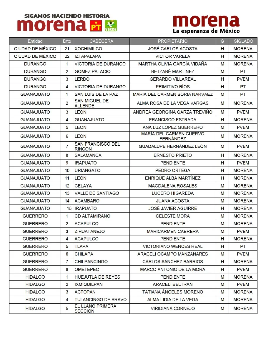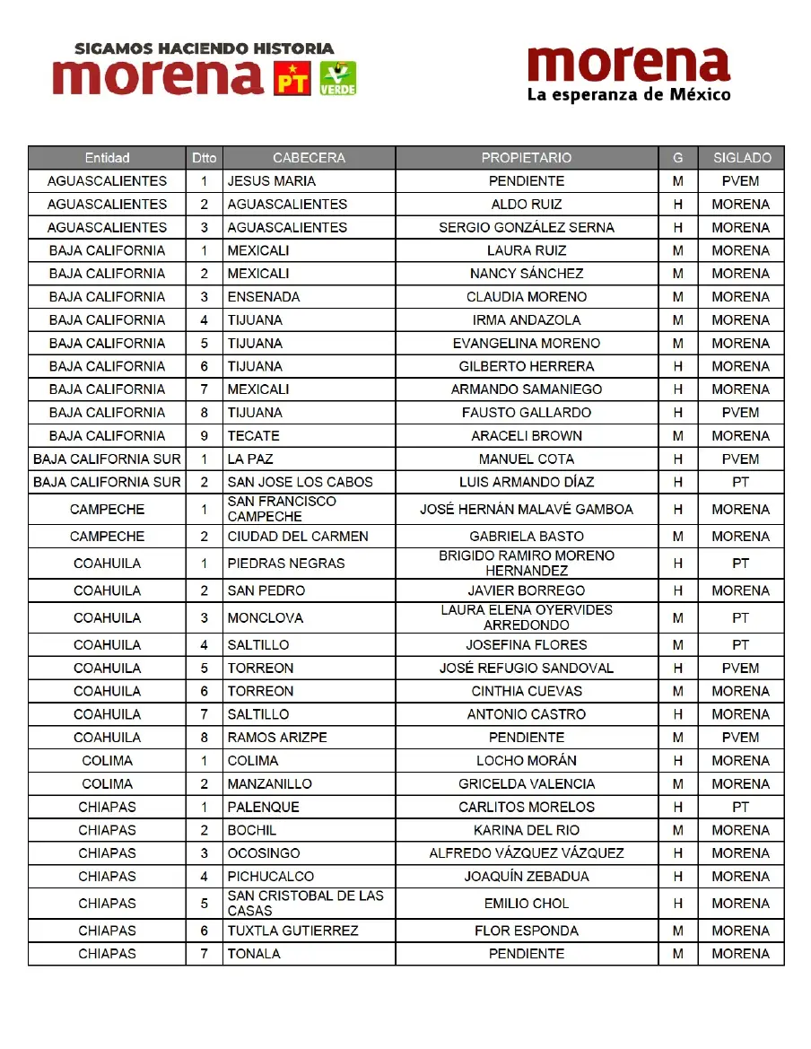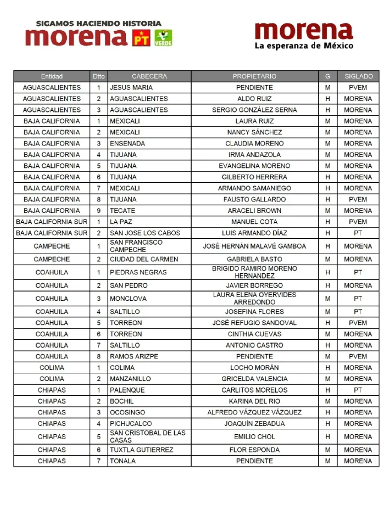 Después de un exhaustivo análisis político, estadístico, la aplicación deun proceso de encuestas y definiciones de estrategia electoral paralograr la mayoría calificada en las Cámaras del Congreso de la Unión yconcretar el Plan C, se presentan las y los candidatos preseleccionadospara competir por los 300 distritos de mayoría relativa de la CoaliciónSigamos Haciendo Historia y MORENA, respectivamente.