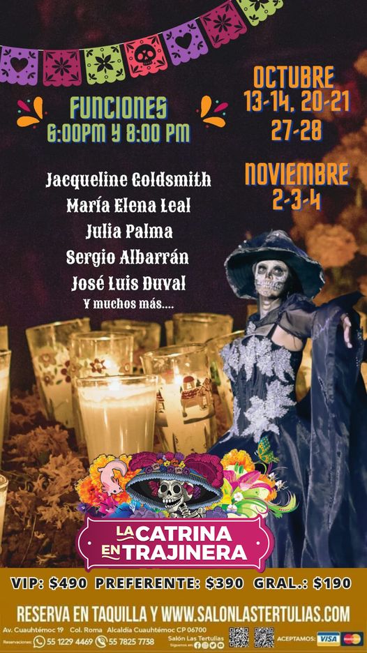 “La Catrina en Trajinera”, llegará a “Las Tertulias” que se convertirá en teatro para deleitar al público con una divertida obra para toda la familia, quienes podrán disfrutar de antojitos, comida y mariachi, en compañía de reconocidas figuras del Cine de Oro mexicano como lo fue Pedro Infante y Jorge Negrete.