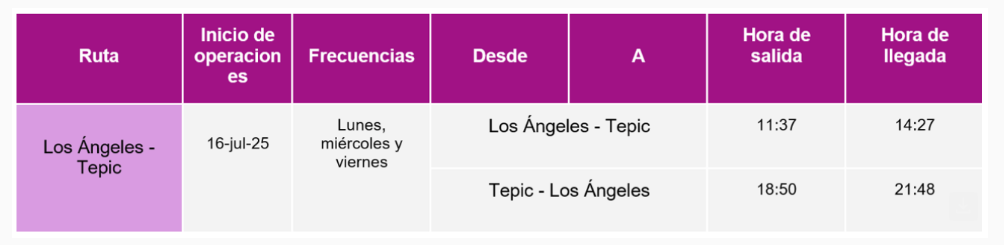 Volaris volará de LAX a TPQ los lunes, miércoles y viernes a partir del 16 de julio, saliendo de LAX a las 11:37 am y llegando a las 2:27 pm Saliendo de TPQ a las 6:50 pm y llegando a LAX a las 9:48 pm El aeropuerto contará con los servicios de inmigración más modernos, lo que permitirá el ingreso al país de forma digital, sin filas.