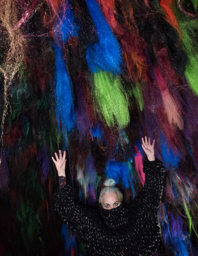 La cantante Björk es una de las personalidades con las que Shoplifter ha colaborado haciendo una sinergia en el tecnicolor a los confines más lejanos de sus instalaciones que trascienden atmósferas bidimensionales a través del cabello sintético con el que están realizadas sus piezas.