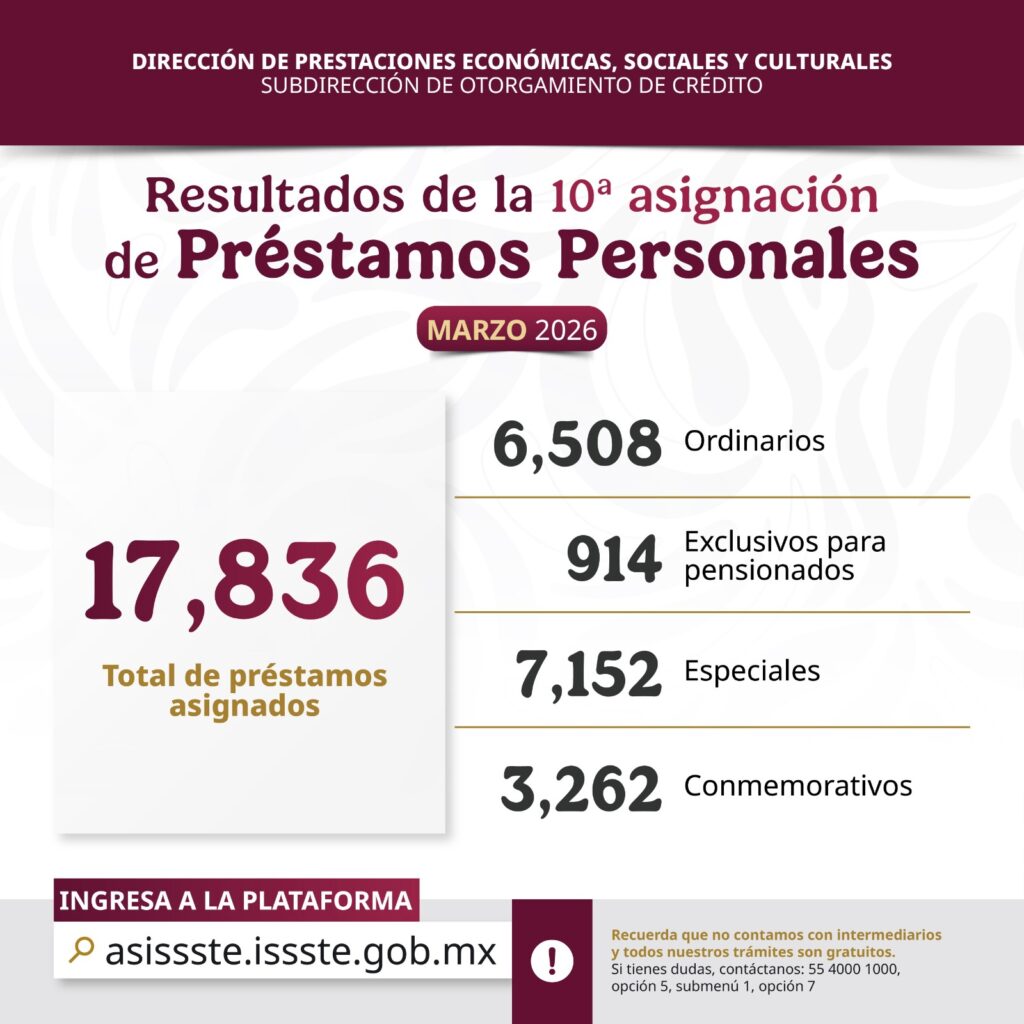 El Instituto de Seguridad y Servicios Sociales de los Trabajadores del Estado (ISSSTE), encabezado por el director general Martí Batres Guadarrama, informa que fueron asignados 17 mil 836 créditos como parte de la décima entrega del Programa Anual de Préstamos Personales 2026, dirigida a las y los derechohabientes que cumplieron con los requisitos establecidos.