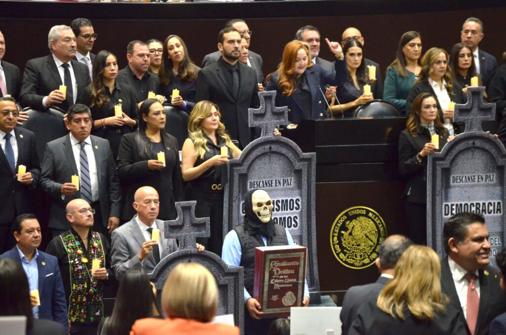 Vestidos de negro, con lápidas y velas en sus curules, diputadas y diputados del PAN muestran su luto a la Constitución Política por la reforma de «Supremacía Dictatorial» de Morena, luego que fuera avalada la reforma contra impugnaciones.