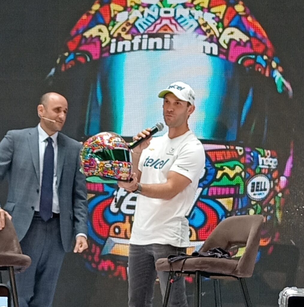 Durante la conferencia, el piloto regiomontano presentó el casco que usaráel fin de semana, queno sólo refleja diversos aspectos de la cultura mexicana, sino además impulsará el espíritu de lucha que caracteriza al mexicano. Es obra del artista Juan Manuel Latapí.
