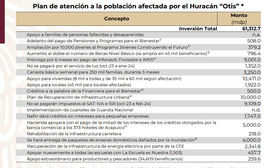 El gobierno federal destinará 61 mil 312.7 millones de pesos en el plan de reconstrucción para atender los daños ocasionados en viviendas, establecimientos comerciales e infraestructura urbana y carretera en Acapulco y Coyuca de Benítez, tras el paso del huracán Otis.