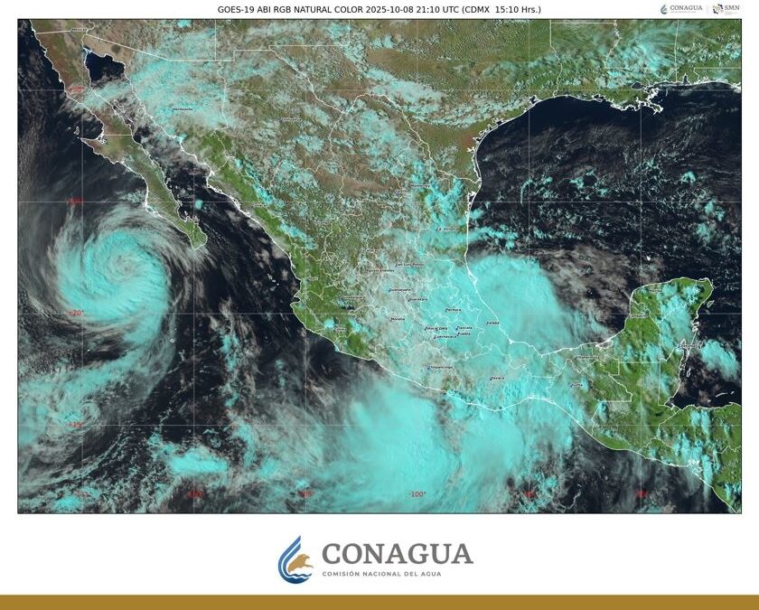 Durante las próximas horas, los desprendimientos nubosos del sistema originarán lluvias muy fuertes (de 50 a 75 milímetros [mm]) y viento de 40 a 50 km/h con rachas de 60 a 80 km/h en el sur de Baja California Sur; intervalos de chubascos (de 5 a 25 mm) y viento de 20 a 30 km/h con rachas de 40 a 60 km/h en costas de Sinaloa y Nayarit, así como oleaje de 5 a 6 metros (m) de altura en la costa occidental y sur de Baja California Sur; de 2.5 a 3.5 m en costas de Sinaloa, Nayarit y Jalisco, y de 1.5 a 2.5 m en costas de Colima.