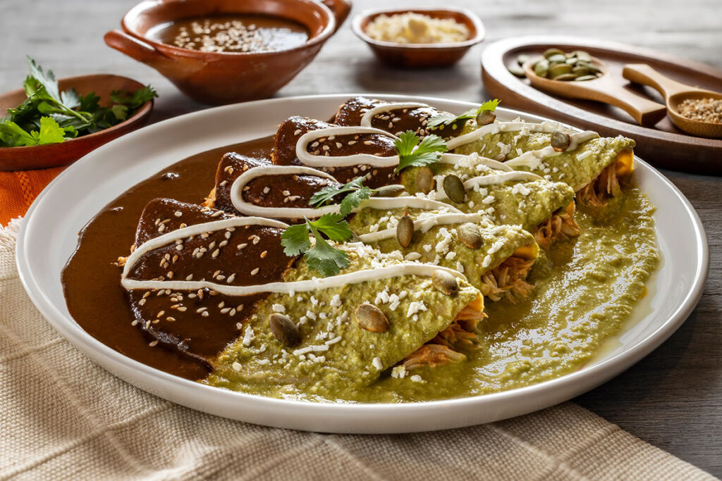 · Las enchiladas bicolor: Sus deliciosas enchiladas con pollo bañadas con mole poblano y pipián verde.