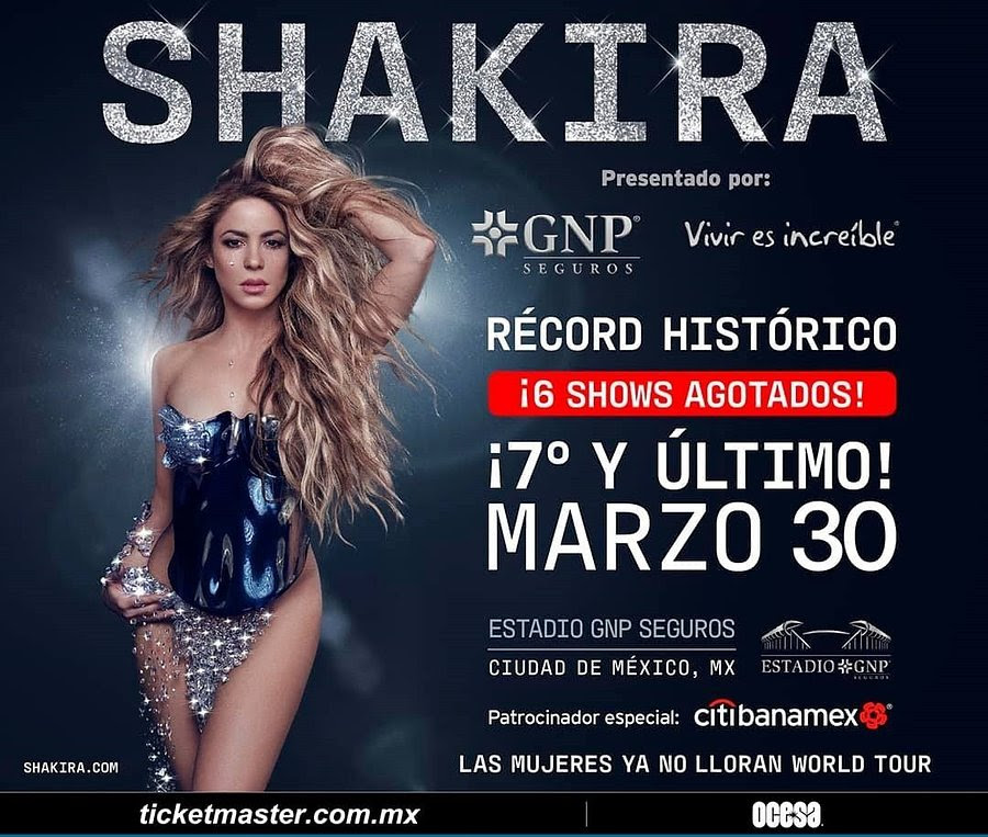 Shakira anuncia su séptima y última fecha en el Estadio GNP Seguros de la Ciudad de México como parte de su histórica gira Las Mujeres Ya No Lloran World Tour, un fenómeno cultural sin precedentes. De esta forma, Shakira se convierte en la primera artista en la historia de México en vender 7 shows consecutivos en este recinto.