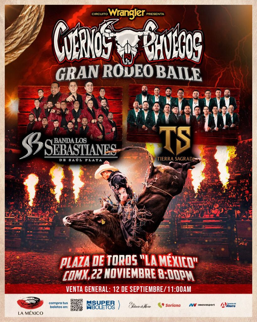 Vive el Gran Rodeo Baile Cuernos Chuecos en La México, con la explosiva presentación de Banda Los Sebastianes y Tierra Sagrada.